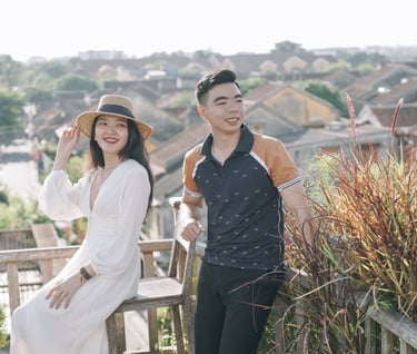 Khung cảnh lãng mạn: Phố cổ Hội An được biết đến với sự kết hợp hoàn hảo giữa kiến trúc cổ điển và không gian xanh mát. Những con đường nhỏ, những ngôi nhà cổ có mái ngói đỏ, và các cây cầu cổ xưa tạo nên một không gian lãng mạn và thơ mộng cho việc chụp ảnh cặp đôi.